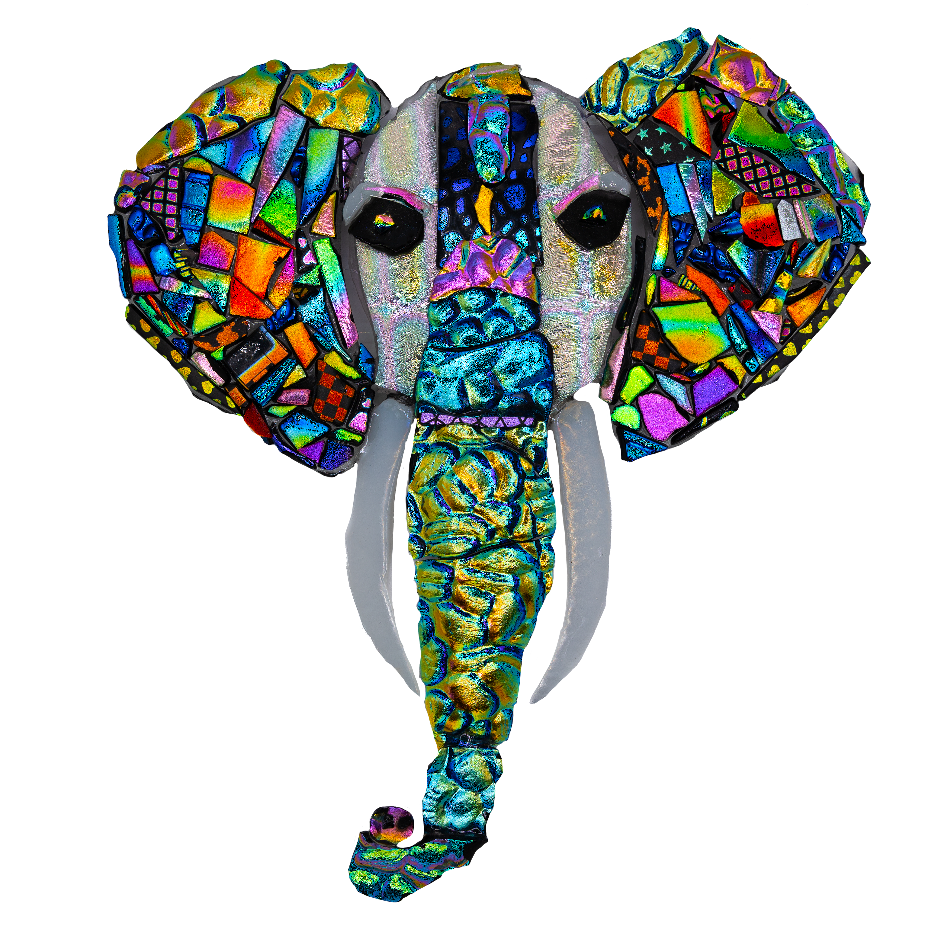 Experience the beauty of an African elephant through this dichroic fused glass piece, radiating a mesmerizing blend of rainbow colors.